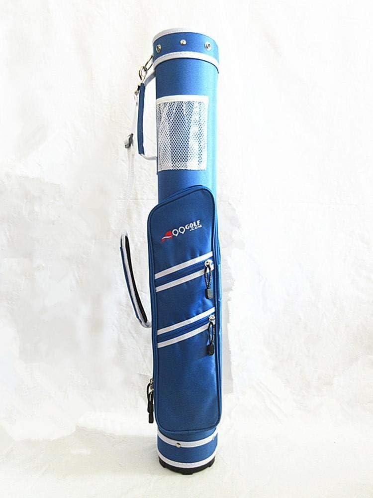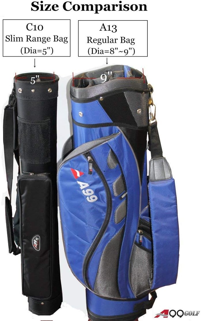 Model: C10 Golf Practice Range Bag Color: Black, Blue, Pink Material: 600D nylon with PVC backing, waterproof Size: 5” (12.7cm) top, 50"(127cm) high, 33" (83.82cm) solid cylinder tube body. can hold 6-7pcs club. Feature: Light weight, can hold half set clubs Removable padded shoulder strap; top is detachable - in side package Full length zipper panel entry for easy removal and placement of clubs Laminated PE tube body construction - not collapsible = easy to put clubs back into the bag.